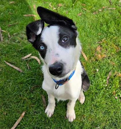 Fog travels beautifully in the car; he is calm, relaxed, and often lying down quietly. His favourite place, though, is simply “wherever you are.” Whether gardening, feeding chickens, or mowing the lawn, Fog will happily supervise every task. He finds chickens interesting but hasn’t chased them, and he is cautious and respectful around stock. Fog is still a young dog learning about the world, which means the occasional boundary