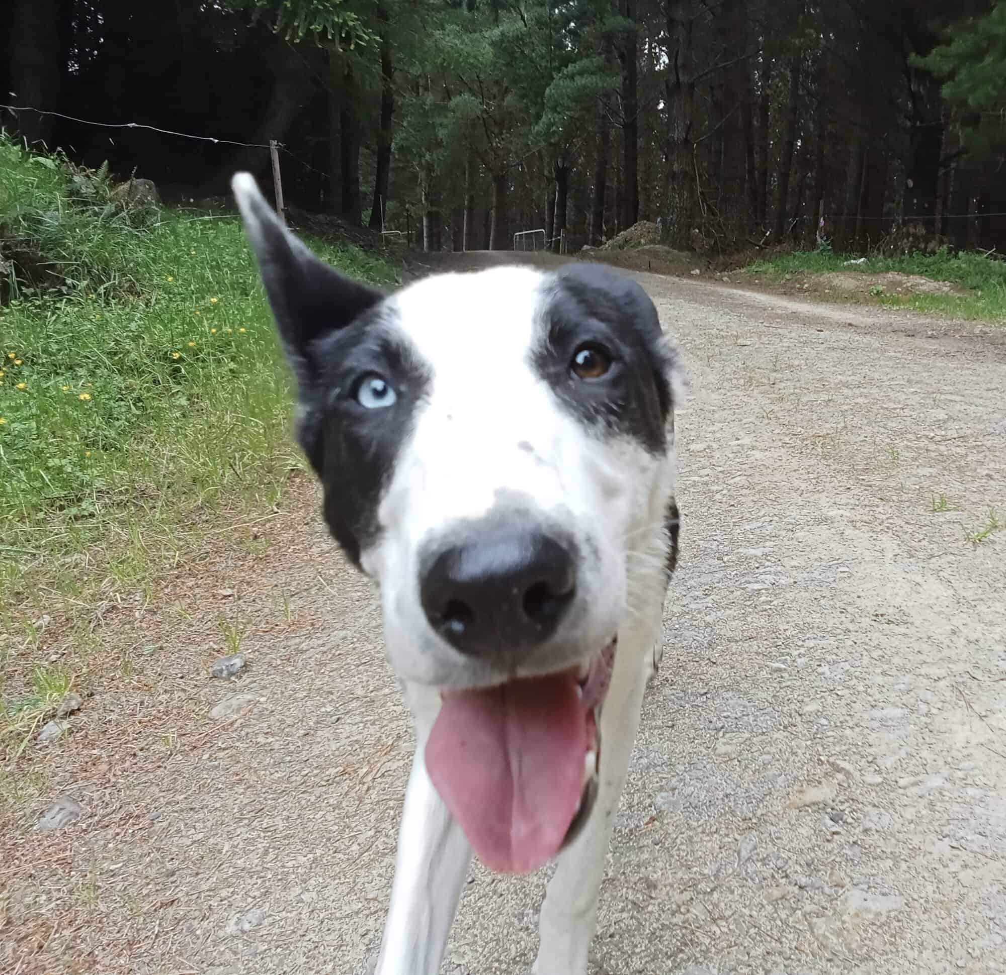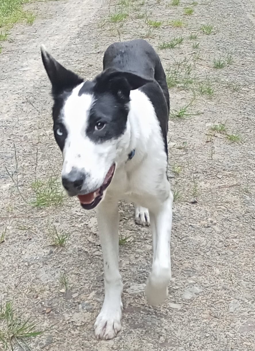 Fog travels beautifully in the car; he is calm, relaxed, and often lying down quietly. His favourite place, though, is simply “wherever you are.” Whether gardening, feeding chickens, or mowing the lawn, Fog will happily supervise every task. He finds chickens interesting but hasn’t chased them, and he is cautious and respectful around stock. Fog is still a young dog learning about the world, which means the occasional boundary