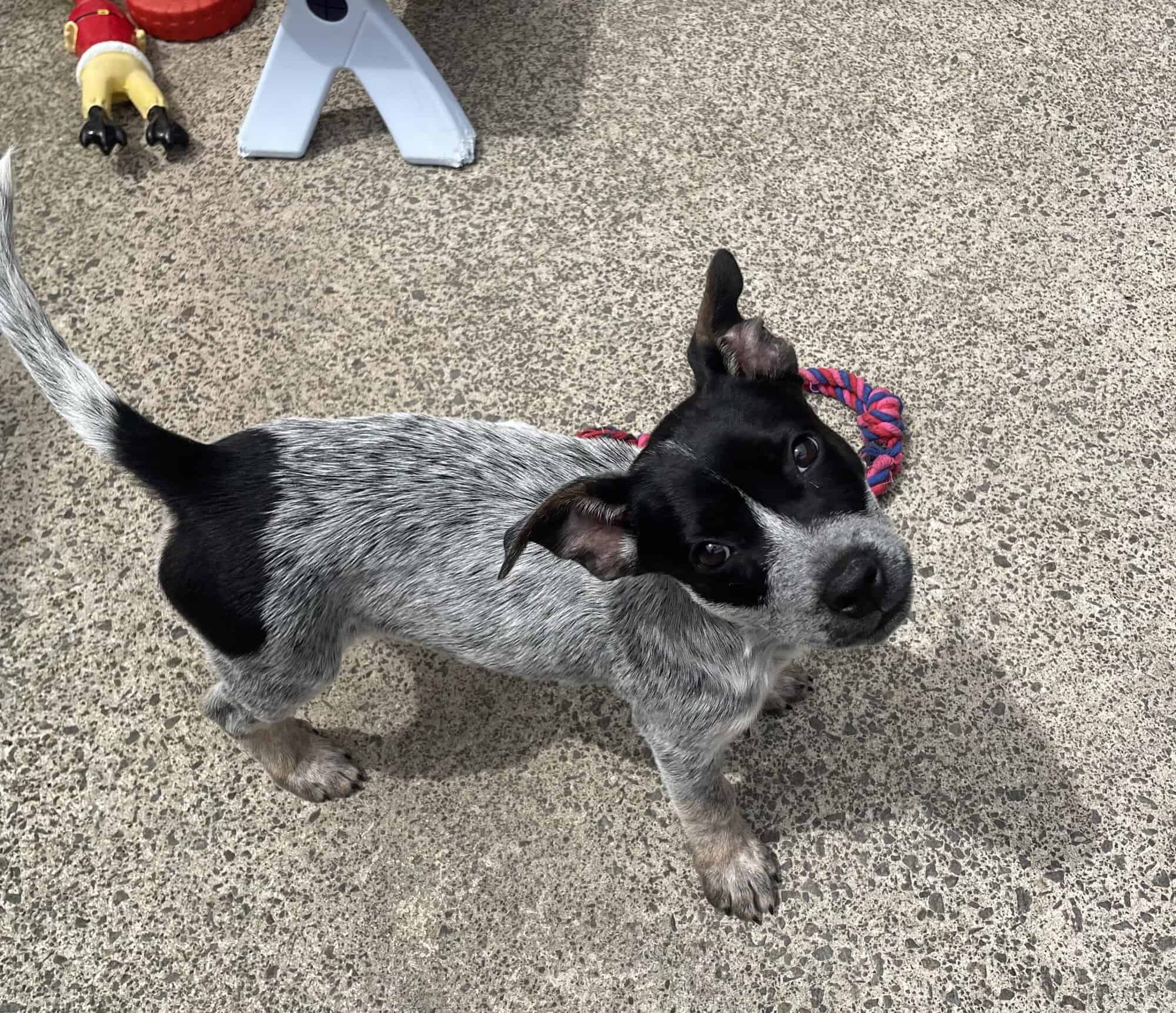 We think she could be a blue heeler mix and grow to be medium sized. She was found abandoned with her siblings so the breed is just our best guess.