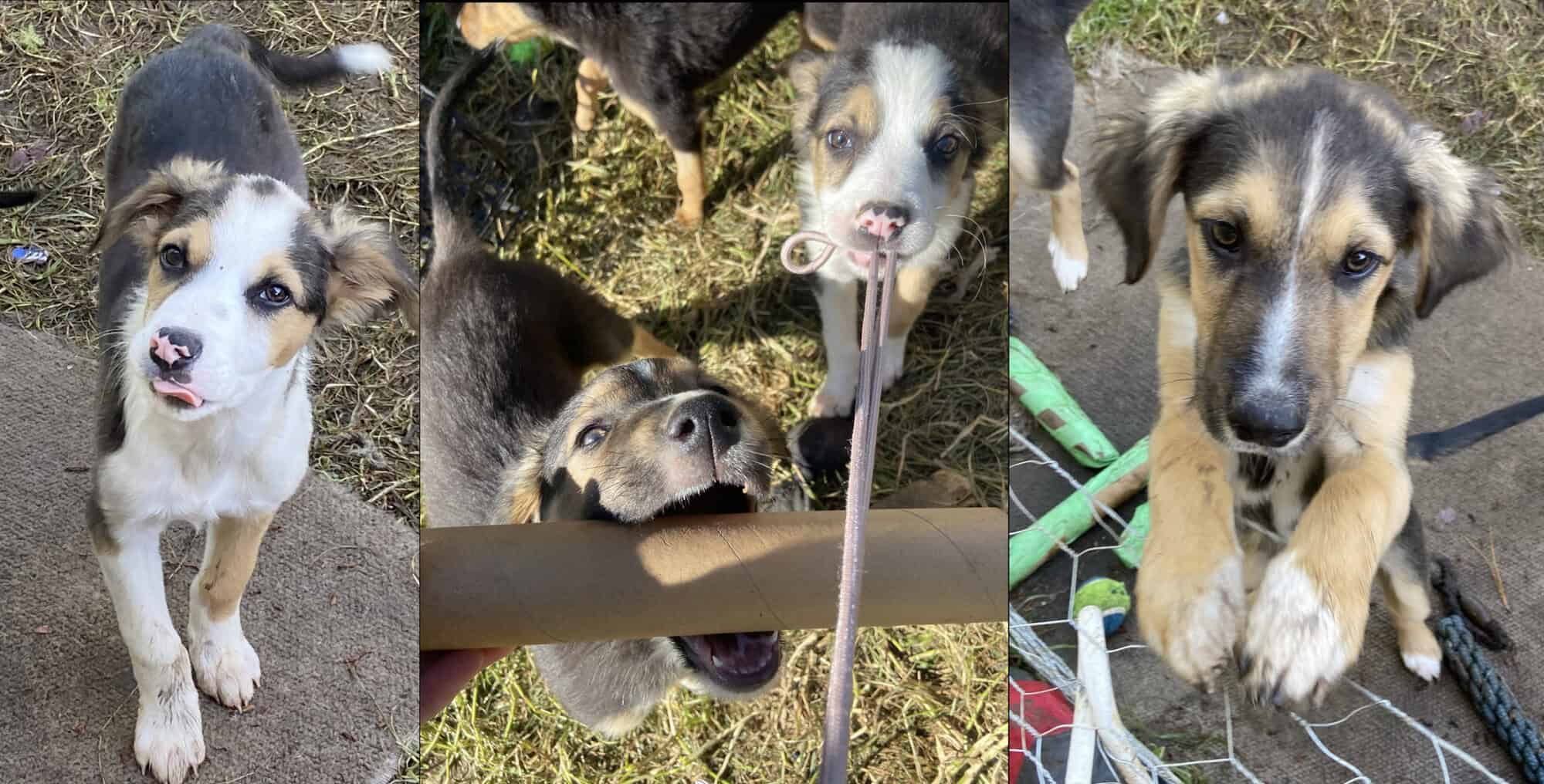 In our care theyโve absolutely flourished: happy, confident, and full of personality. Rex (white stripe and fluffy ears) is sharp, quick to learn (a real thinker) and quite cuddly when he’s not wriggling. Tom (lots of white) is loyal, a bit bossy to his brothers, and adores attention. Both are strong, affectionate pups who love people and play.