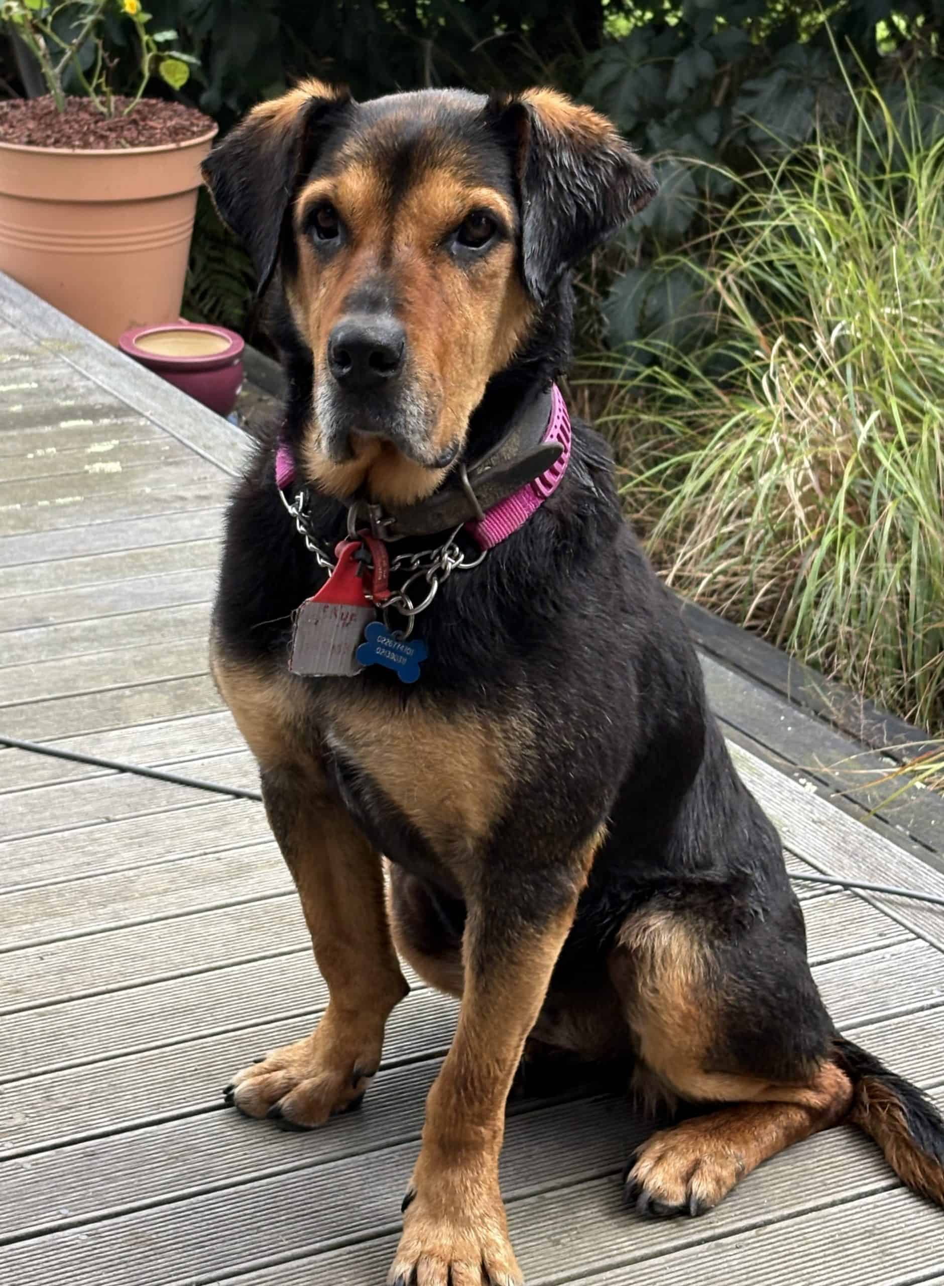 She’s still mobile, in good health, respectful of fencing, and easy to have around. She’s been good with other dogs, though busy or loud ones can overwhelm her — a calm, confident companion would suit her best. Her favourite place? Curled up in her bed on the deck, just watching the world go by.